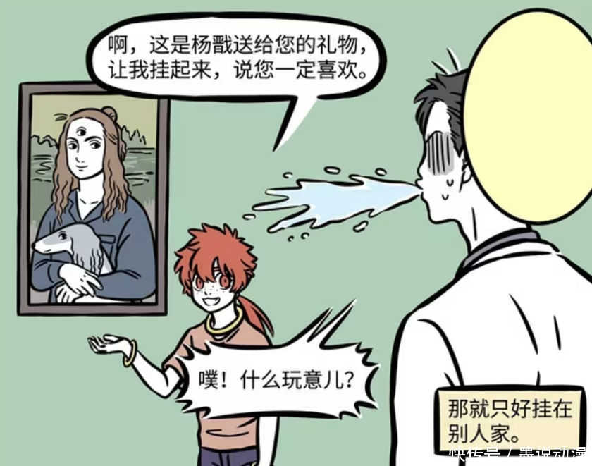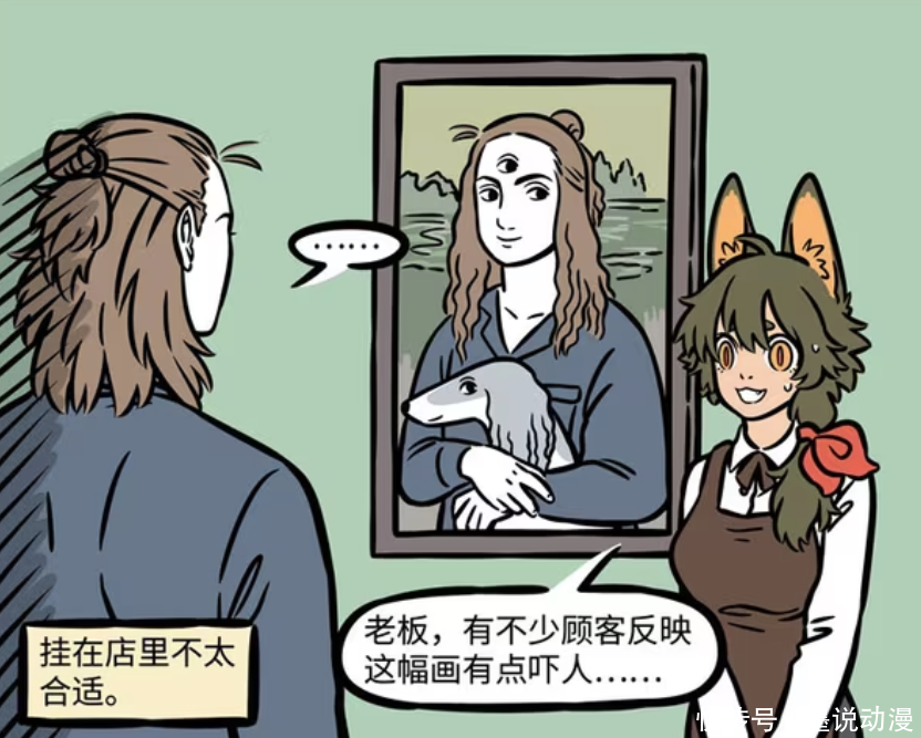 《非东谈主哉》漫画版中,哮天有过一段技术神机密秘,杨戬以为哮天要跟他断交。施行上,哮天是在茶肆打工,准备给杨戬买礼物。看到礼物之后,杨戬无法收受。这幅画是参考《蒙娜丽莎》,仅仅放在动物咖啡厅,会让主顾吓到。最终杨戬将此画不雅音,还让红孩儿一定要挂在墙上。