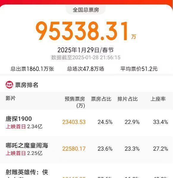据国内电影平台所涌现,大年月吉本日的累计预售票房跳跃了9.5亿东谈主民币,而《射雕》本日的预售票房却还莫得达到2亿东谈主民币。再便是它也依然丢掉了当日预售票房冠军的位置,退居到了第三名。