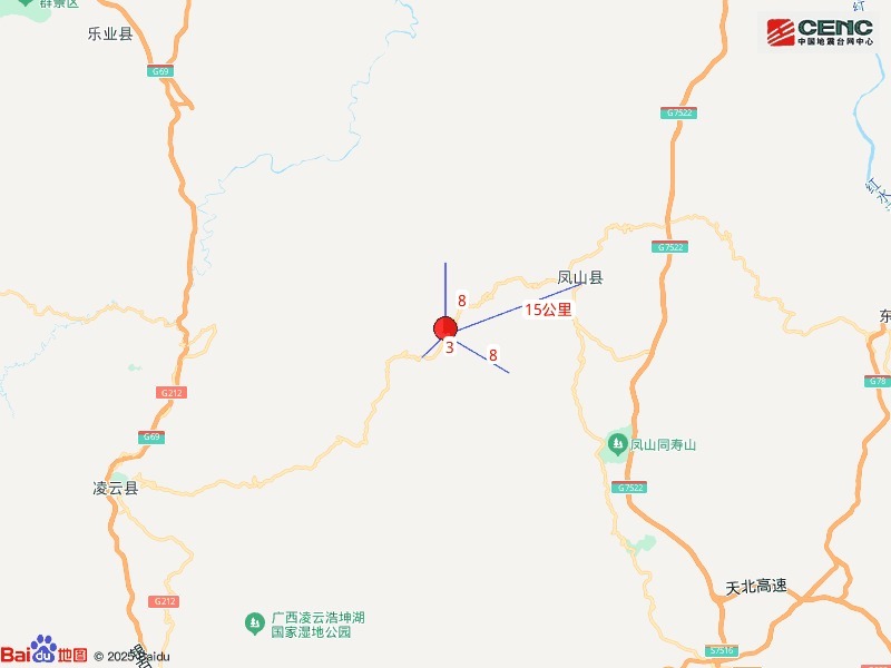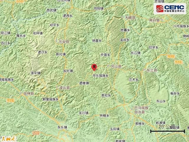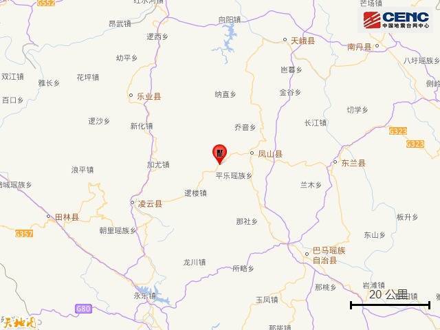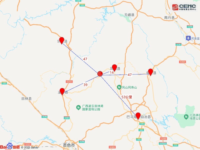 左近县城:震中距凤山县14公里、距凌云县39公里、距东兰县47公里、距乐业县47公里、距巴马瑶族自治县53公里,距百色市73公里,距贵阳市235公里。