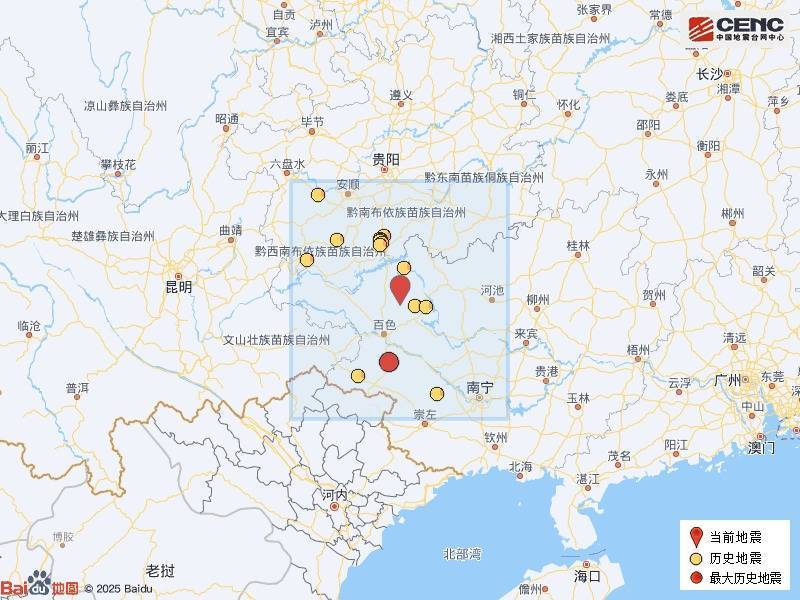 历史地震:阐明中国地震台网速报目次,震中左近200公里内近5年来发生3级以上地震共20次,最地面震是2021年8月4日在广西百色市德保县发生的4.8级地震(距离本次震中126公里),历史地震散播如图。