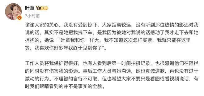 在舆情发酵之后,叶童在个东谈主酬酢平台发文回答了此事。主如若向公众阐发我方没受到惊吓,也匡助该粉丝突围说不是她拽下车的,是我方主动下车和她拥抱的。同期还进展了责任主谈主员保护我方保护的很好,临了感谢粉丝补助。