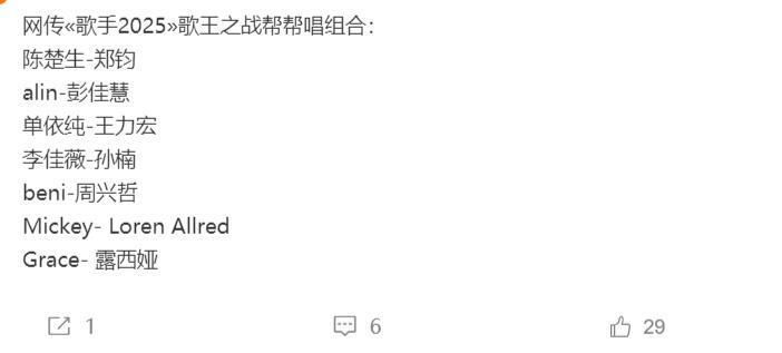 诸君读者,你们期待《歌手2025》总决赛吗?跟着节目播出,《歌手2025》行将迎来第13期节目,也便是总决赛。近日,网上传出《歌手2025》帮唱歌手名单,从名单上看,陈楚生稳中求进,而单依纯与王炸歌手配合,果然有望争夺歌王,诸君读者,你们怎样看呢?