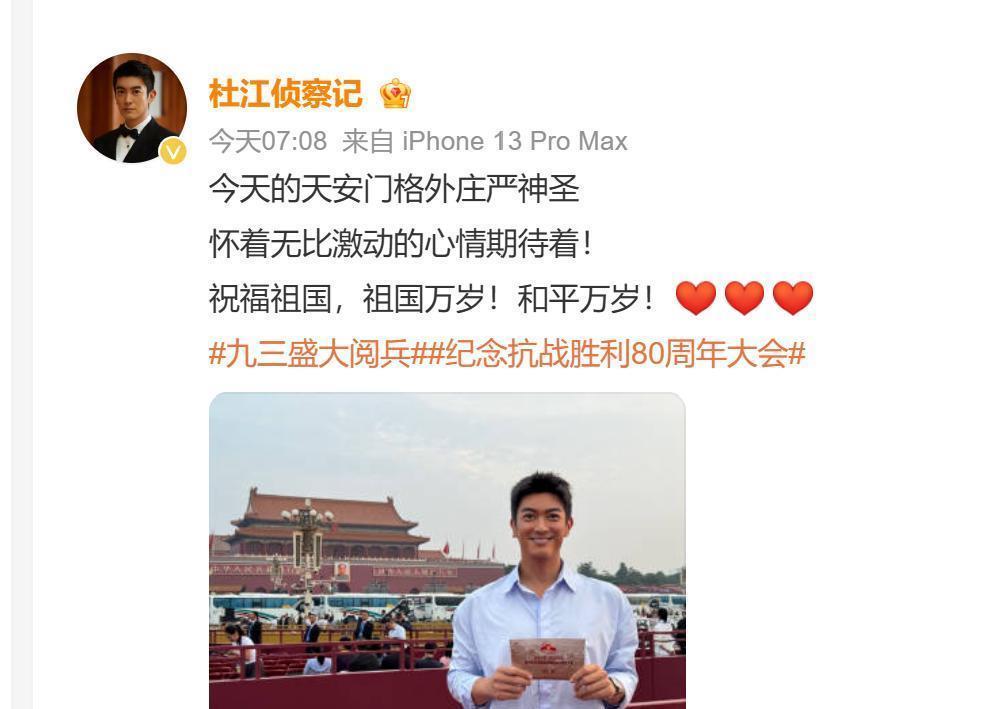 杜江还承袭了现场媒体的采访,不愧是参演过《红海举止》《蛟龙举止》《志愿军》等影视片的演员,杜江的发言也太专科了,一看便是作念过作业的,他说极度期待我国军东谈主的分列式。看过雠校式的不雅众应该王人被军东谈主的伟貌所纳降了吧。