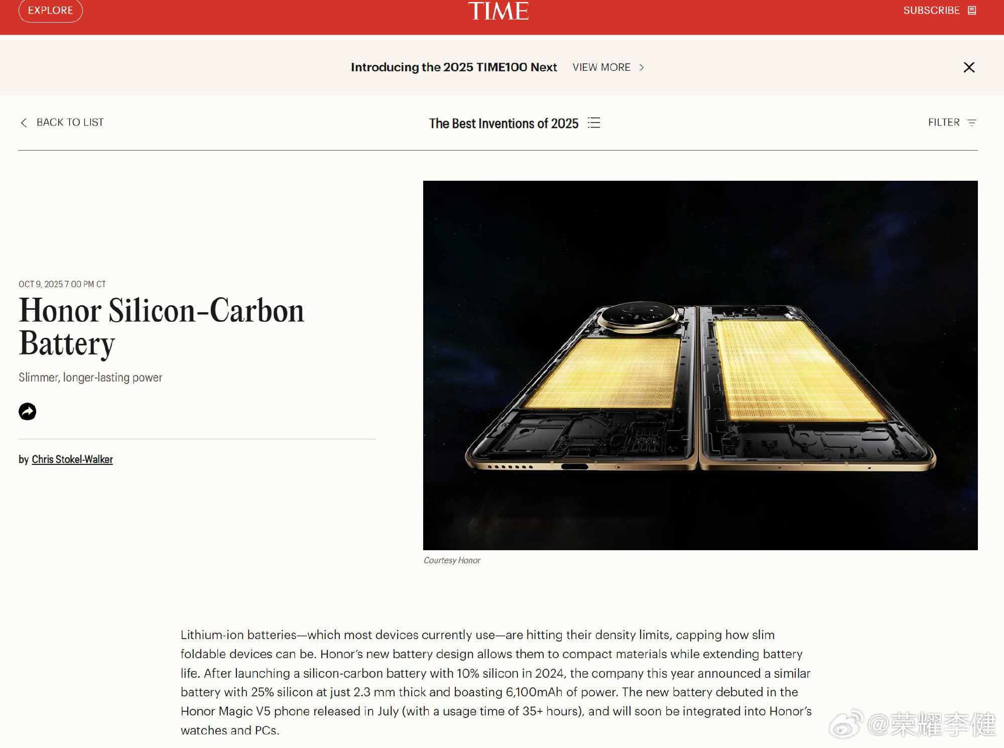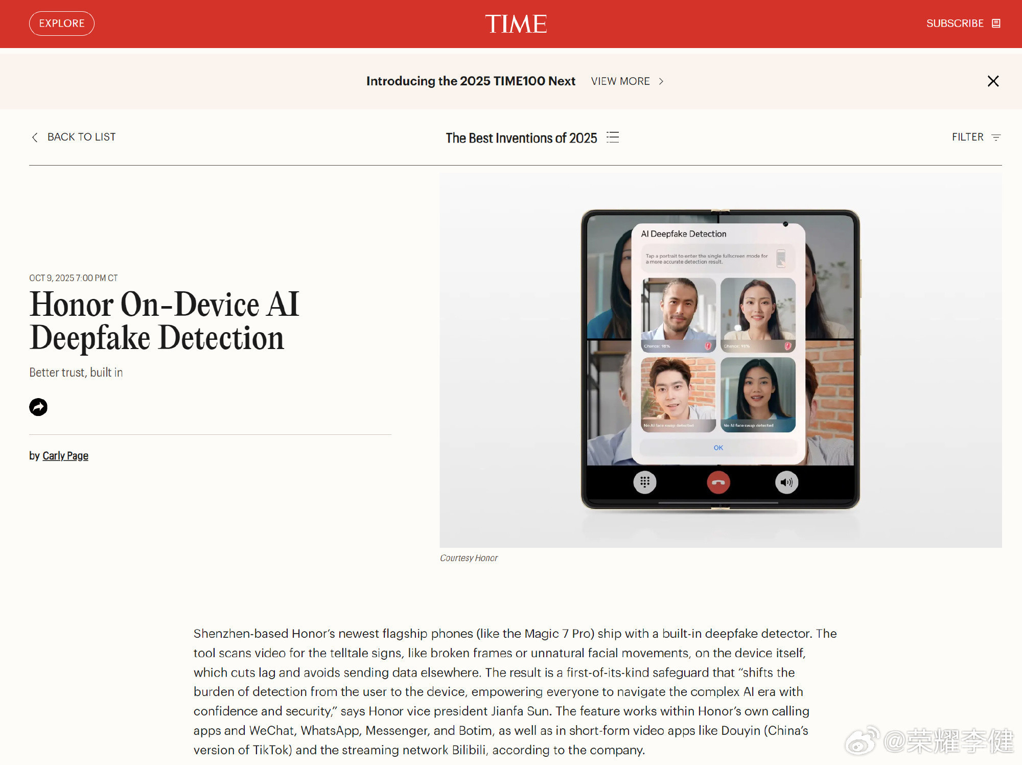 【CNMO科技音书】近日,荣耀终局CEO李健在外交平台上文书,荣耀的“青海湖刀片电板”与“端侧AI换脸检测技艺”双双入选《期间周刊》2025年“最好发明”榜单,成为今年度唯独斩获主榜两项大奖的中国品牌。
