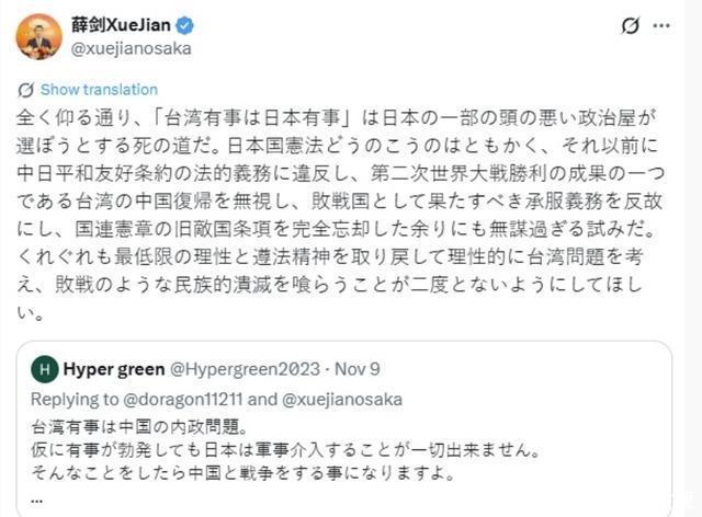 薛剑总领事再次陈说高市早苗的涉台言论,他说台湾有事的论调“是日本某些愚蠢的政客妄图选择的弃世之路”,还说日方此举是对同一国宪章的公然寻衅。这话说得很让东谈主过瘾,但同期也直戳日方的肺管子。